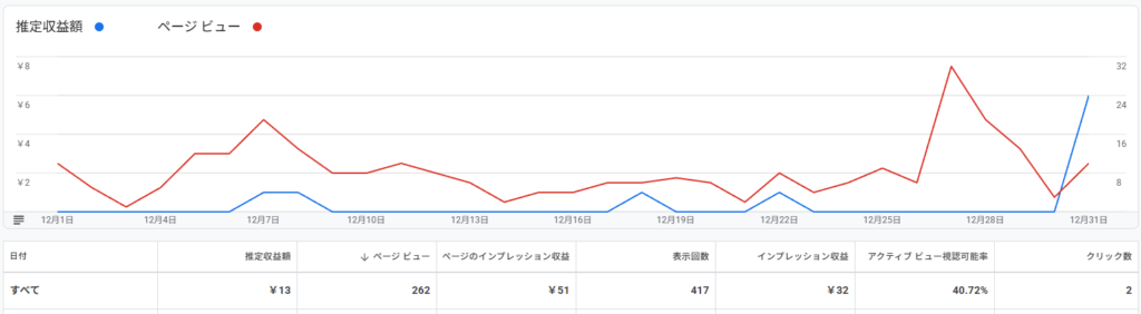実績 収益費用収支34円1,100円▲1,066円 ※サーバーレンタル料を月額で1,100円として計算しています。 大晦日の謎の収益 更新頻度が戻ったおかげか、ページビューが0の日がな…