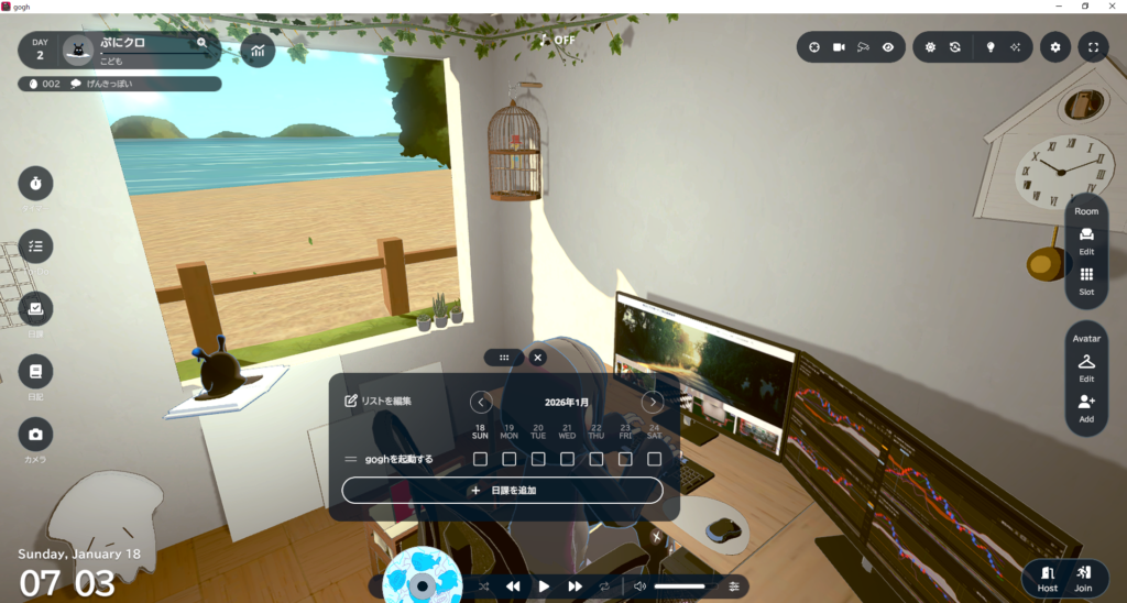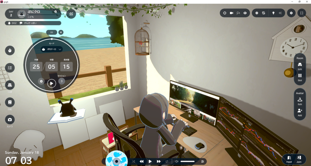 gogh: Focus with Your Avatarは『マルチプレイ・オンライン・作業用ゲーム』です。理想の作業部屋とかわいいアバターをカスタマイズして、互いの部屋に集まって一緒に集中しよう。タイマーやToDo、Lofi音楽や美しい環境音で、あなたのデスクワークをもっと楽しく!