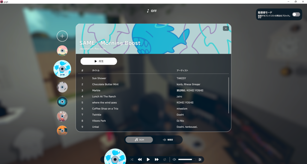 個人的に、環境音の鳥とか虫の声とかも好きなんですが、時間帯でON、OFFを
